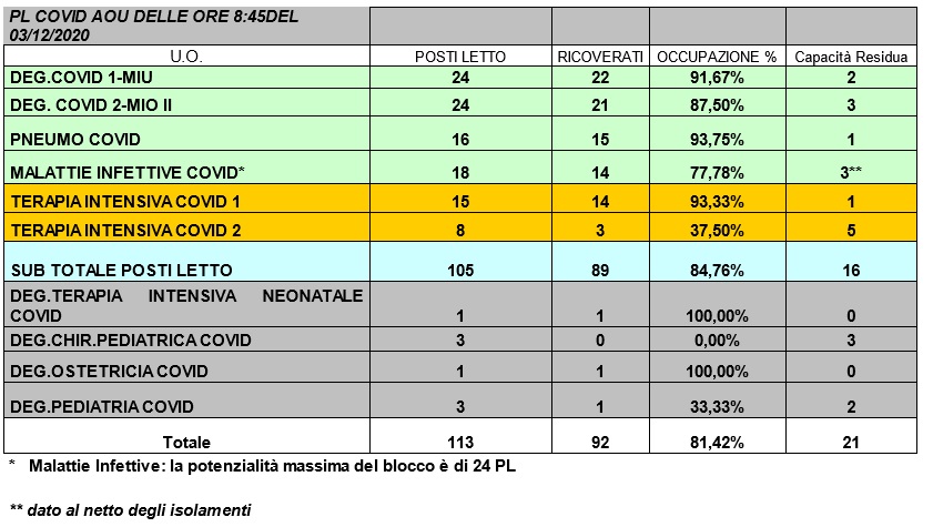 Situazione posti letto reparti Covid -3 dicembre 2020 - ore 8.30.jpg