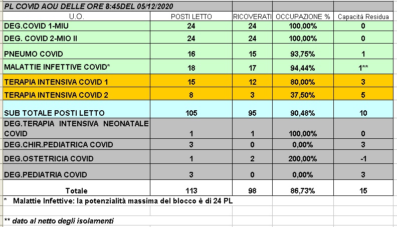 Situazione posti letto reparti Covid -5 dicembre 2020 - ore 8.30.jpg