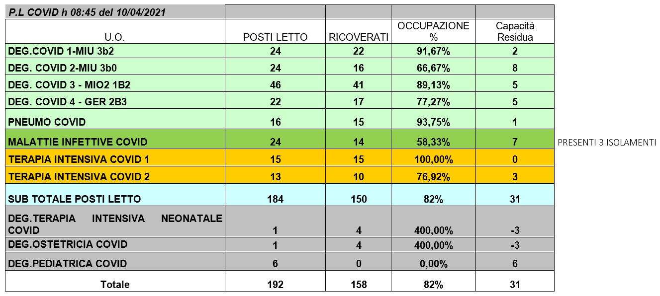 Situazione posti letto reparti Covid 10 aprile 2021 - ore 8.45.jpg