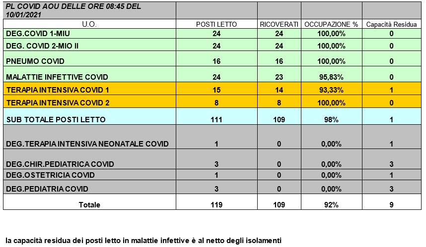 Situazione posti letto reparti Covid 10 gennaio 2021 - ore 8.30.jpg