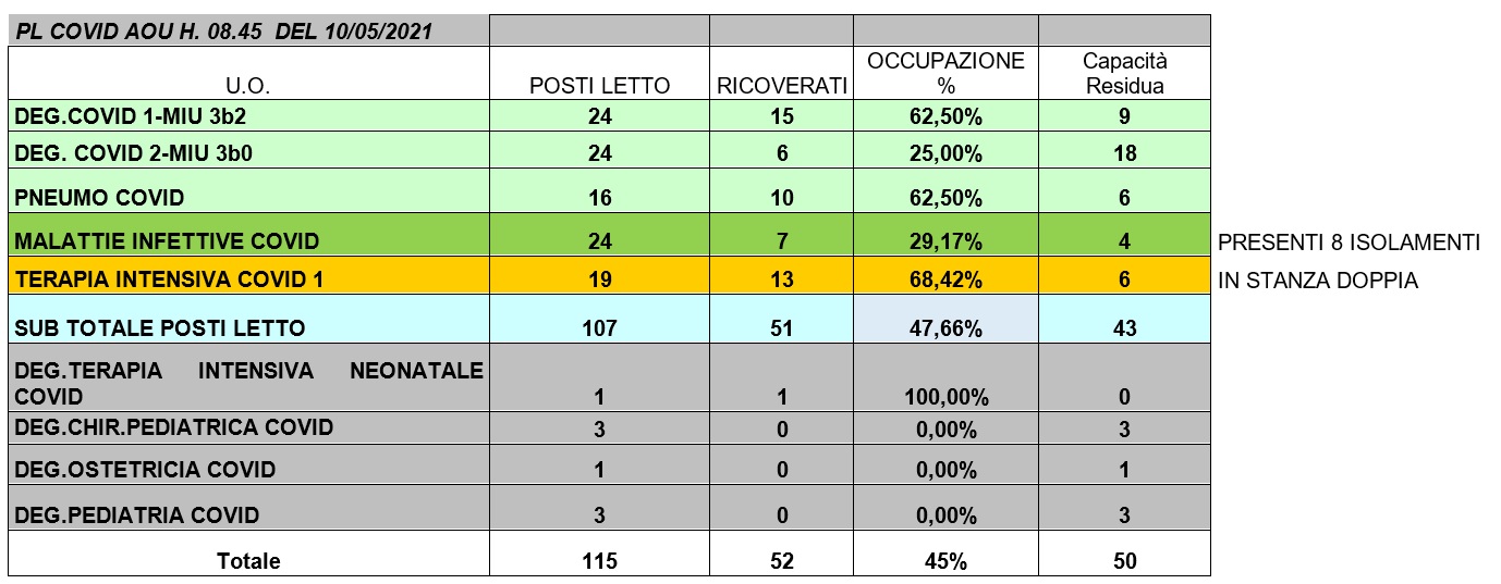 Situazione posti letto reparti Covid 10 maggio 2021 - ore 8.45.jpg