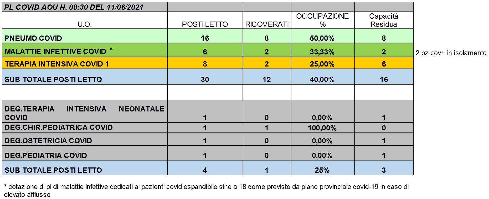 Situazione posti letto reparti Covid 11 Giugno 2021 - ore 8.30.jpg