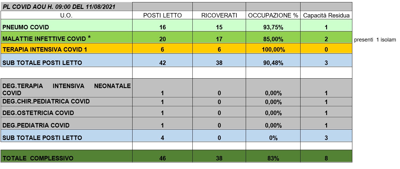 Situazione posti letto reparti Covid 11 agosto 2021 - ore 9.00.jpg