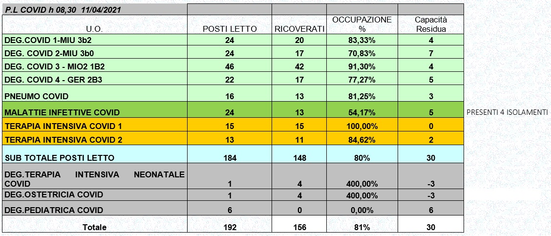 Situazione posti letto reparti Covid 11 aprile 2021 - ore 8.30.jpg