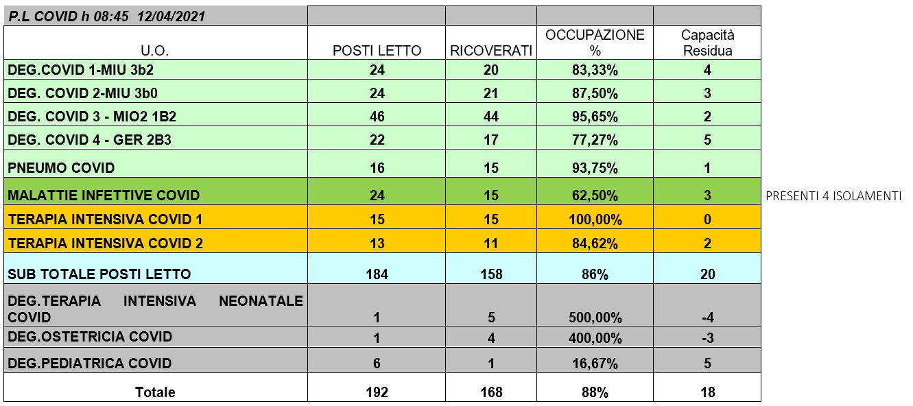 Situazione posti letto reparti Covid 12 aprile 2021 - ore 8.45.jpg