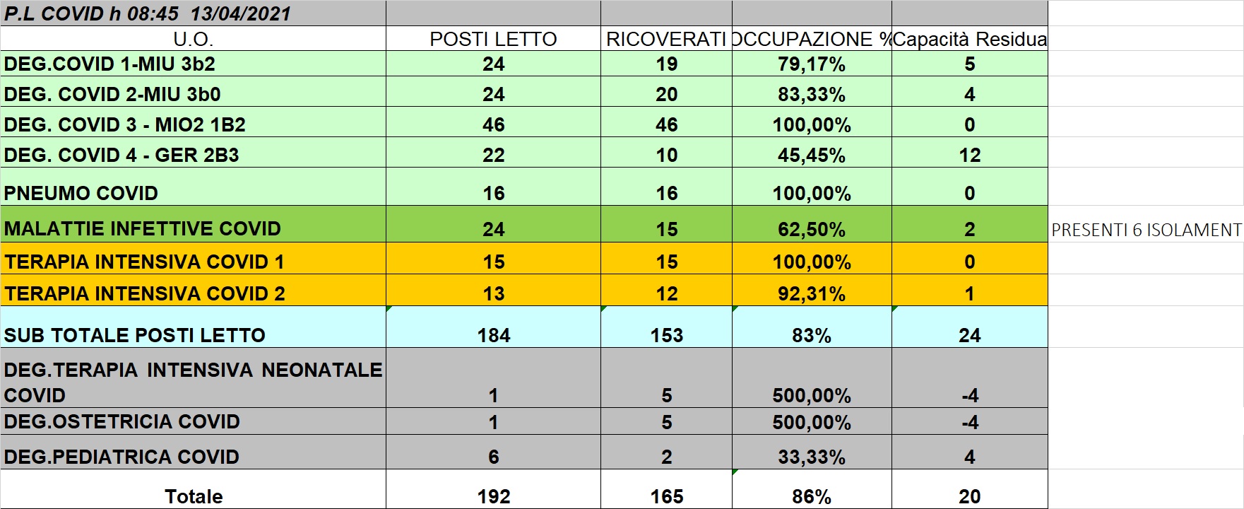 Situazione posti letto reparti Covid 13 aprile 2021 - ore 8.45.jpg