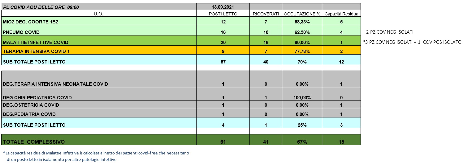 Situazione posti letto reparti Covid 13 settembre 2021 - ore 9.00.jpg