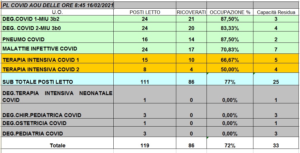 Situazione posti letto reparti Covid 16 febbraio 2021 - ore 8.30.jpg