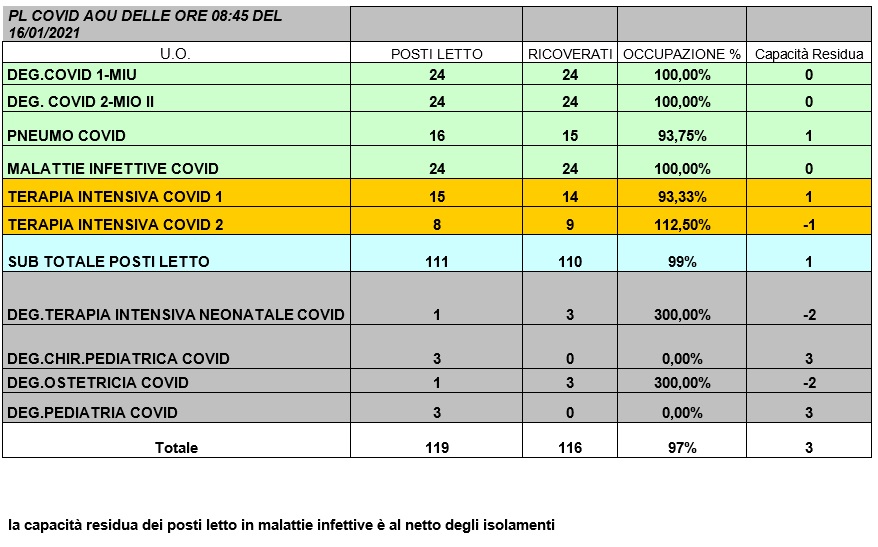 Situazione posti letto reparti Covid 16 gennaio 2021 - ore 8.45.jpg