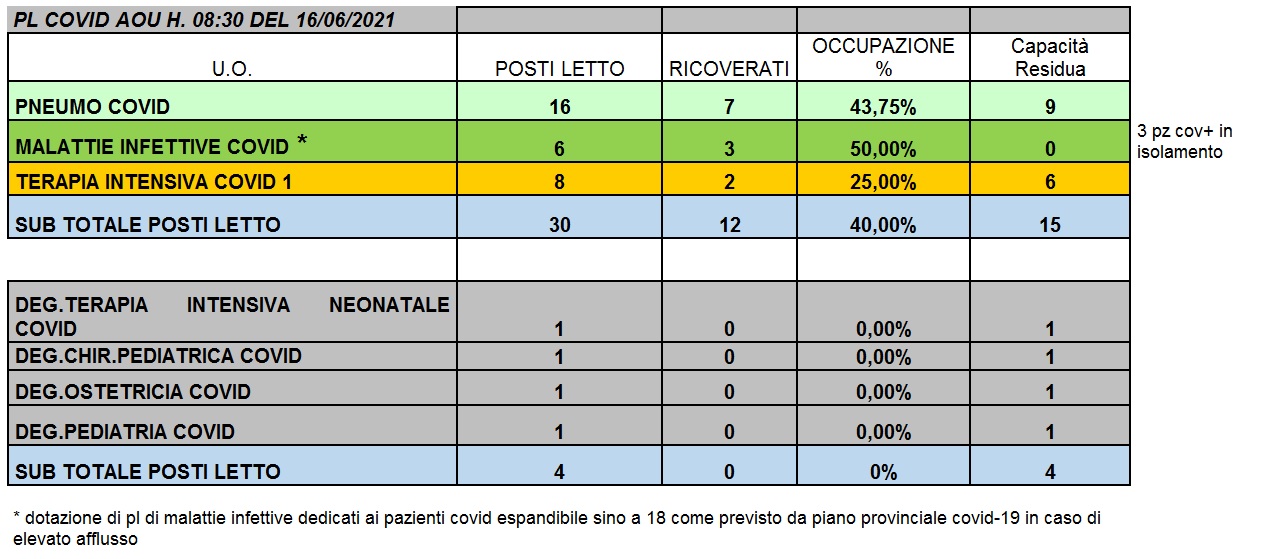Situazione posti letto reparti Covid 16 giugno 2021 - ore 8.30.jpg
