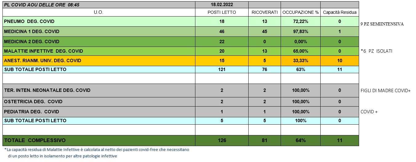 Situazione posti letto reparti Covid 18 Febbraio 2022 - ore 8.45.jpg