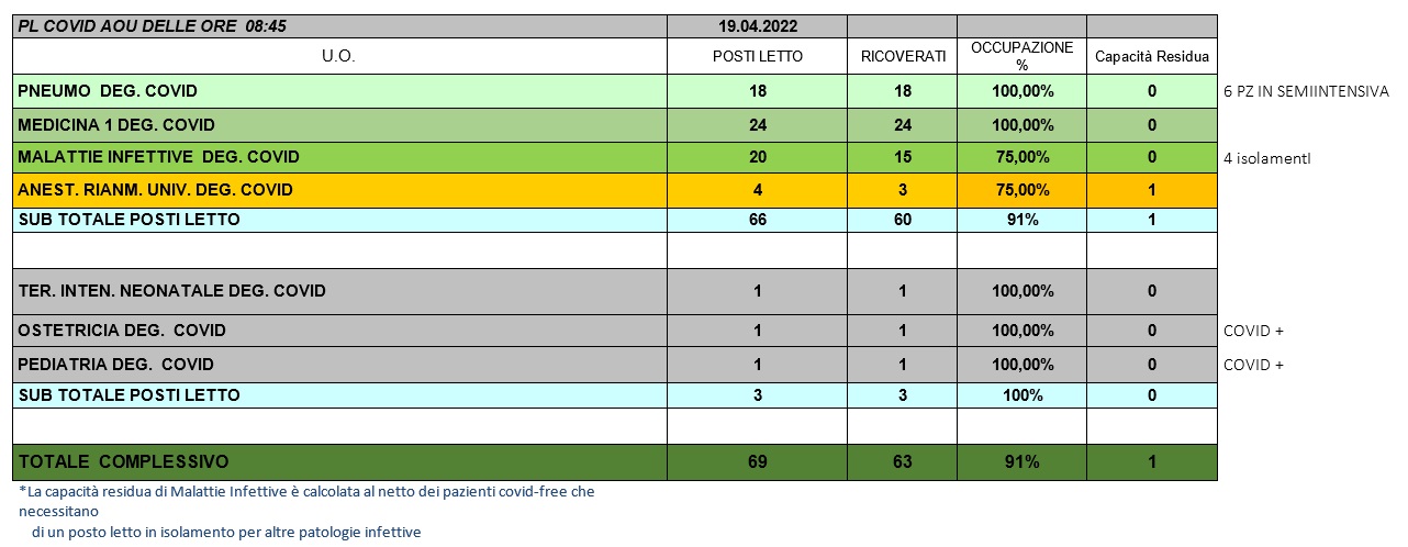 Situazione posti letto reparti Covid 19 aprile 2022 - ore 8.45.jpg