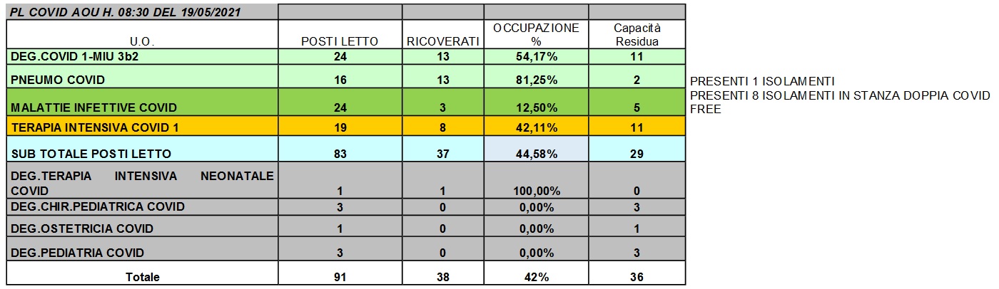 Situazione posti letto reparti Covid 19 maggio 2021 - ore 8.30.jpg
