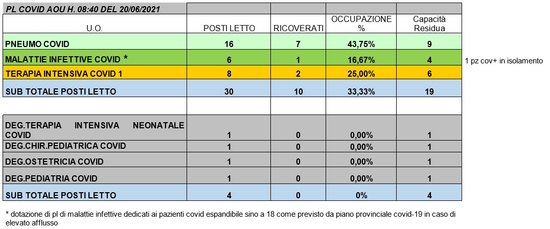 Situazione posti letto reparti Covid 20 giugno 2021 - ore 8.30.jpg