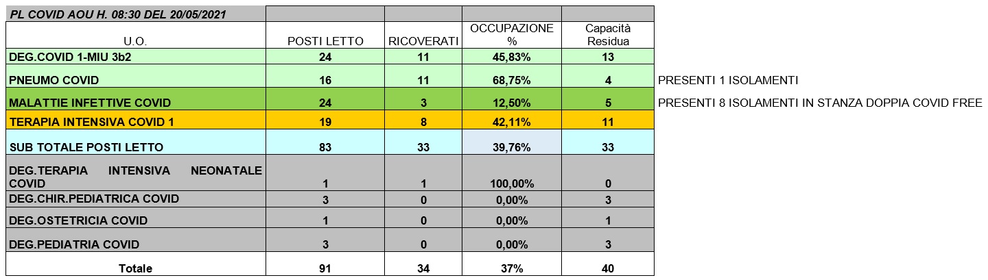 Situazione posti letto reparti Covid 20 maggio 2021 - ore 8.30.jpg