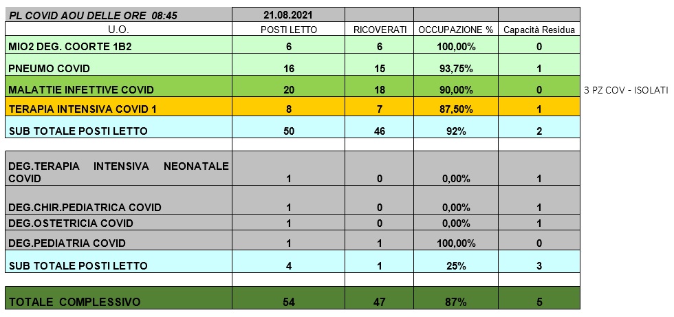 Situazione posti letto reparti Covid 21 agosto 2021 - ore 8.30.jpg