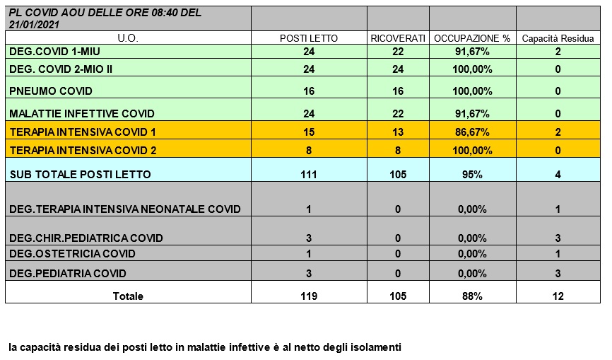 Situazione posti letto reparti Covid 21 gennaio 2021 - ore 8.30.jpg