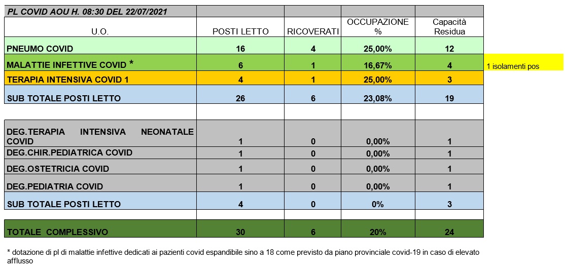 Situazione posti letto reparti Covid 22 luglio 2021 - ore 8.30.jpg