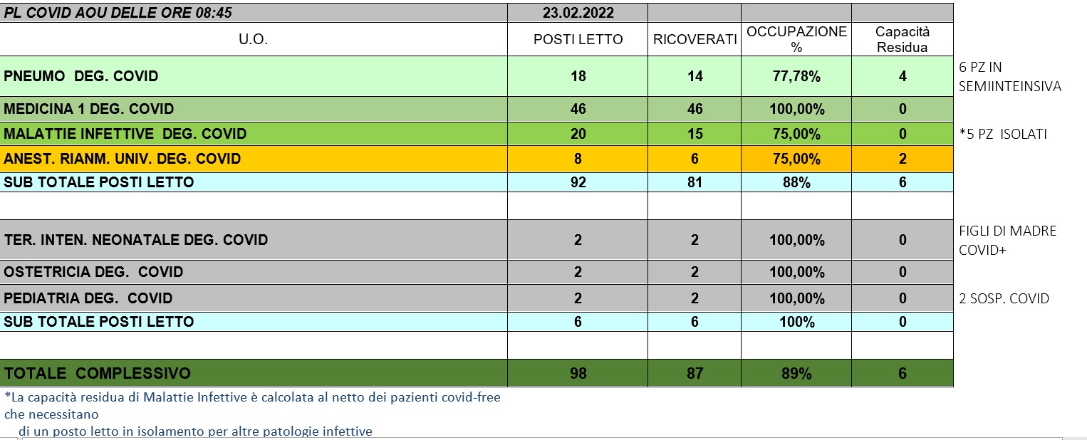 Situazione posti letto reparti Covid 23 Febbraio 2022 - ore 8.45.jpg