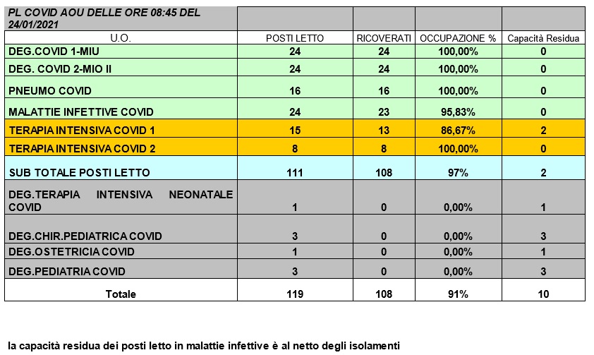 Situazione posti letto reparti Covid 24 gennaio 2021 - ore 8.30.jpg