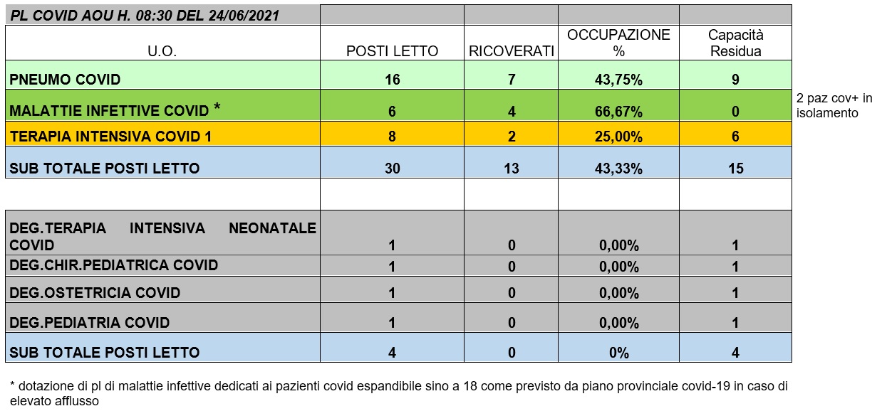 Situazione posti letto reparti Covid 24 giugno 2021 - ore 8.30.jpg