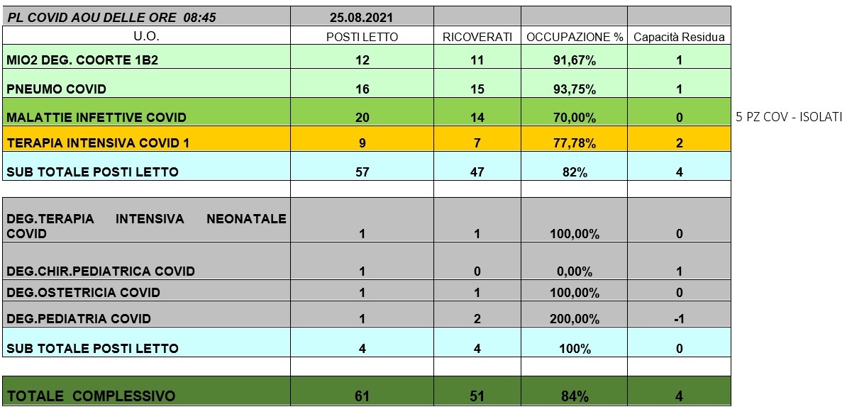 Situazione posti letto reparti Covid 25 agosto 2021 - ore 8.45.jpg