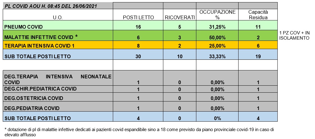Situazione posti letto reparti Covid 26 giugno 2021 - ore 8.30.jpg