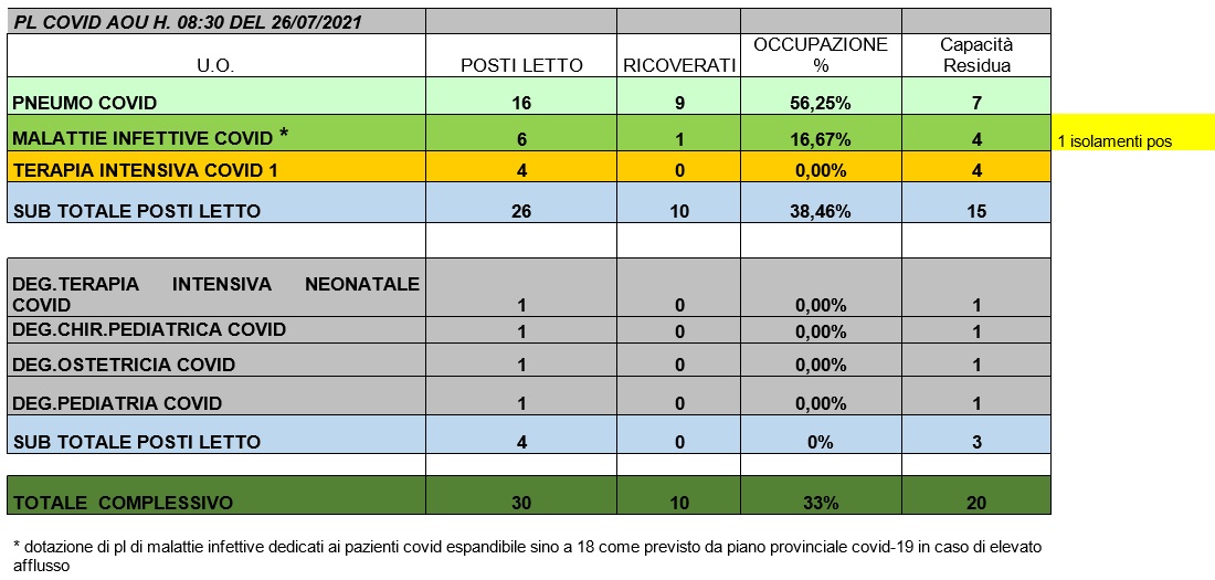Situazione posti letto reparti Covid 26 luglio 2021 - ore 8.30.jpg