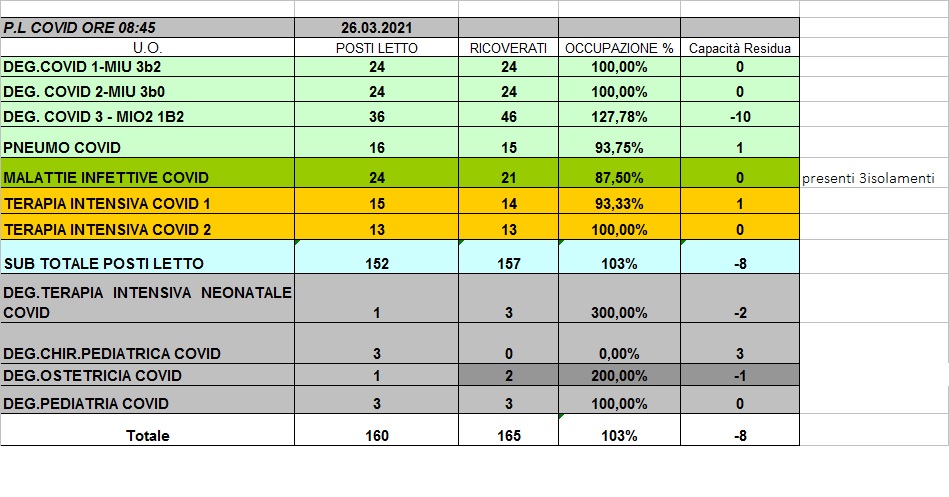 Situazione posti letto reparti Covid 26 marzo 2021 - ore 8.45.jpg