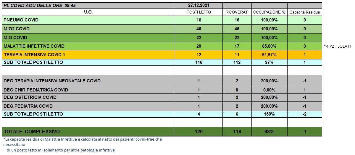 Situazione posti letto reparti Covid 27 Dicembre 2021 - ore 8.45.jpg