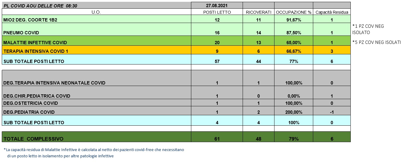 Situazione posti letto reparti Covid 27 agosto 2021 - ore 8.30.jpg