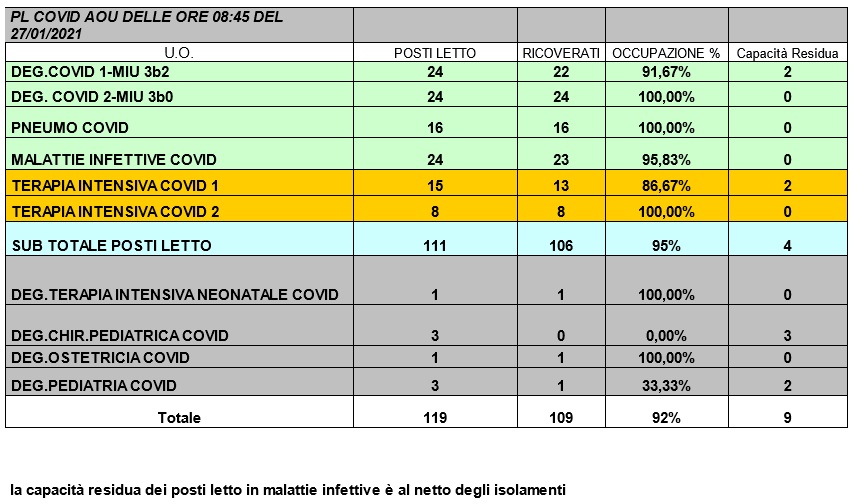 Situazione posti letto reparti Covid 27 gennaio 2021 - ore 8.30.jpg