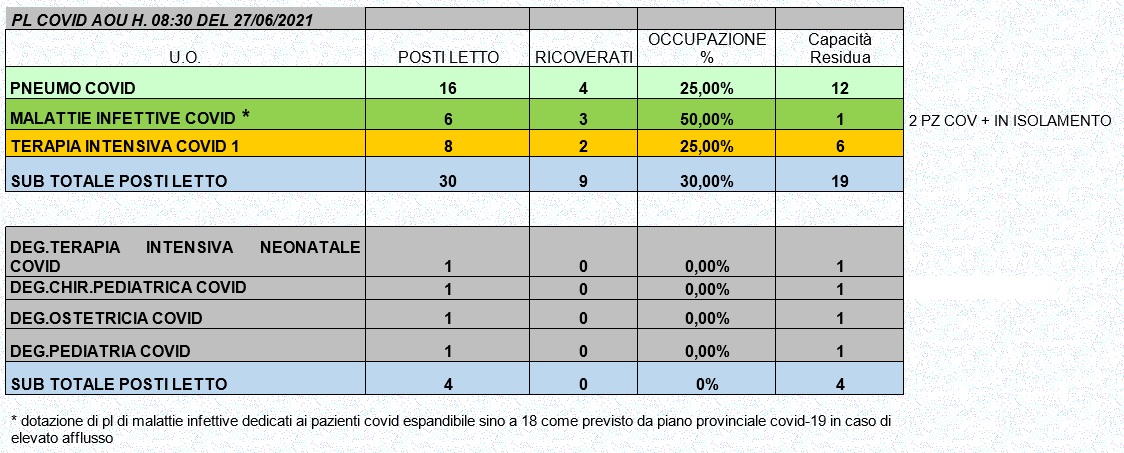 Situazione posti letto reparti Covid 27 giugno 2021 - ore 8.30.jpg