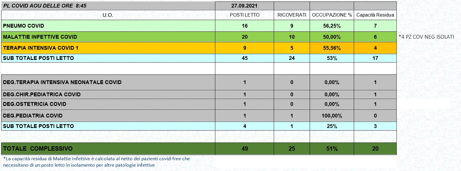 Situazione posti letto reparti Covid 27 settembre 2021 - ore 8.45.jpg