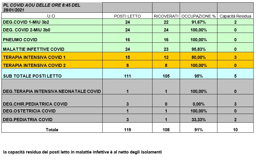 Situazione posti letto reparti Covid 28 gennaio 2021 - ore 8.45.jpg