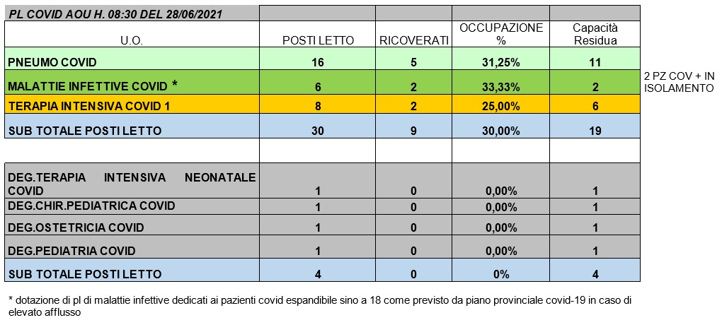 Situazione posti letto reparti Covid 28 giugno 2021 - ore 8.30.jpg