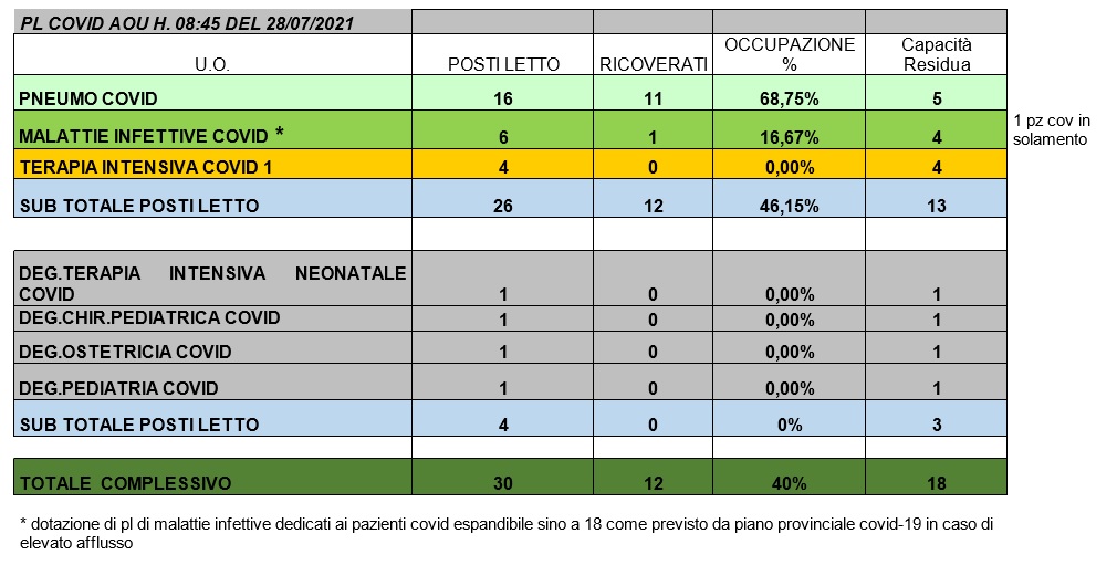 Situazione posti letto reparti Covid 28 luglio 2021 - ore 8.30.jpg