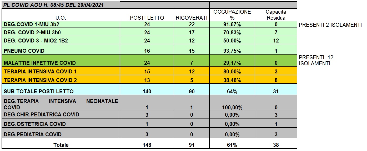 Situazione posti letto reparti Covid 29 aprile 2021 - ore 8.30.jpg