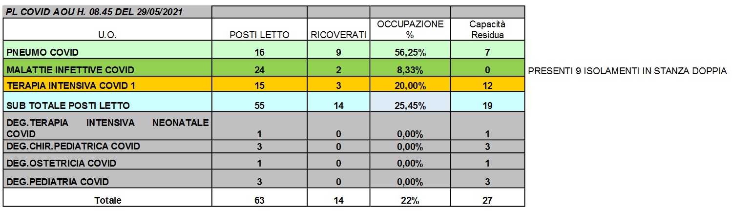 Situazione posti letto reparti Covid 29 maggio 2021 - ore 8.30.jpg