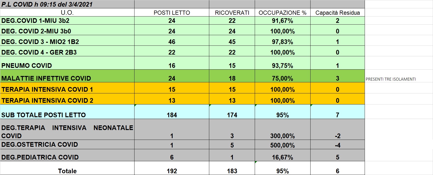 Situazione posti letto reparti Covid 3 aprile 2021 - ore 9.45.jpg