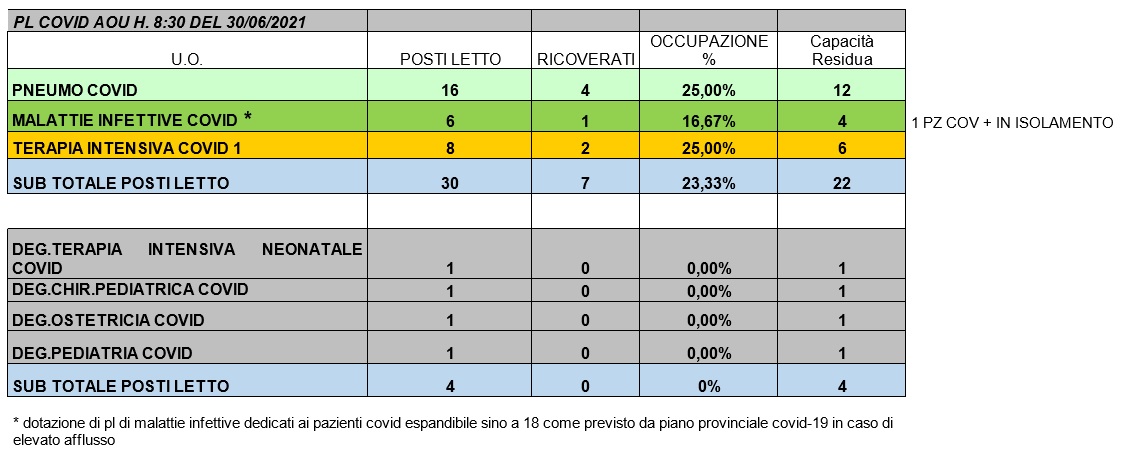 Situazione posti letto reparti Covid 30 giugno 2021 - ore 8.30.jpg