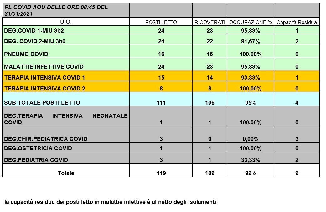 Situazione posti letto reparti Covid 31 gennaio 2021 - ore 8.45.jpg