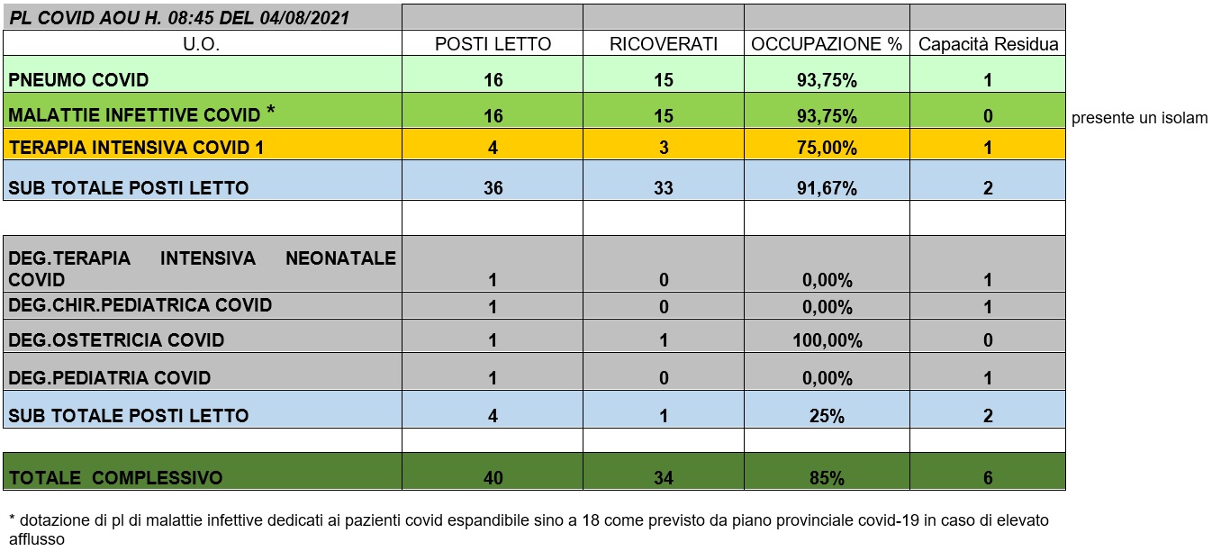 Situazione posti letto reparti Covid 4 agosto 2021 - ore 8.45.jpg