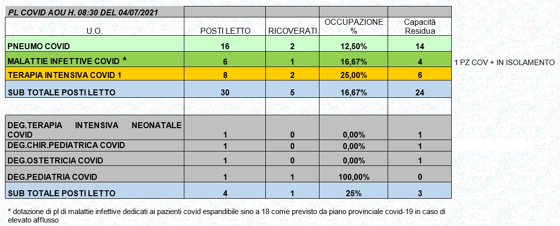 Situazione posti letto reparti Covid 4 luglio 2021 - ore 8.30.jpg
