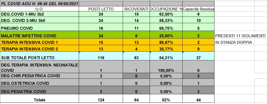 Situazione posti letto reparti Covid 5 maggio 2021 - ore 8.30.jpg