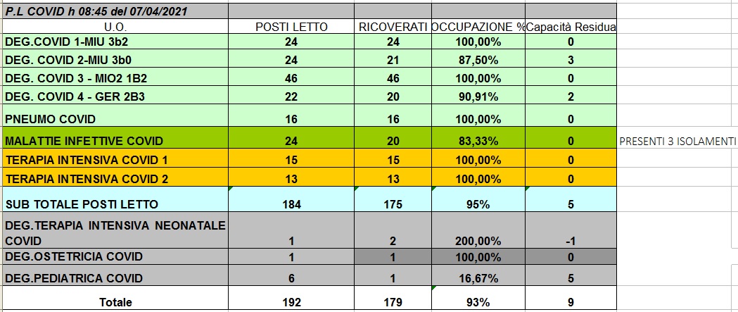Situazione posti letto reparti Covid 7 aprile 2021 - ore 8.30.jpg