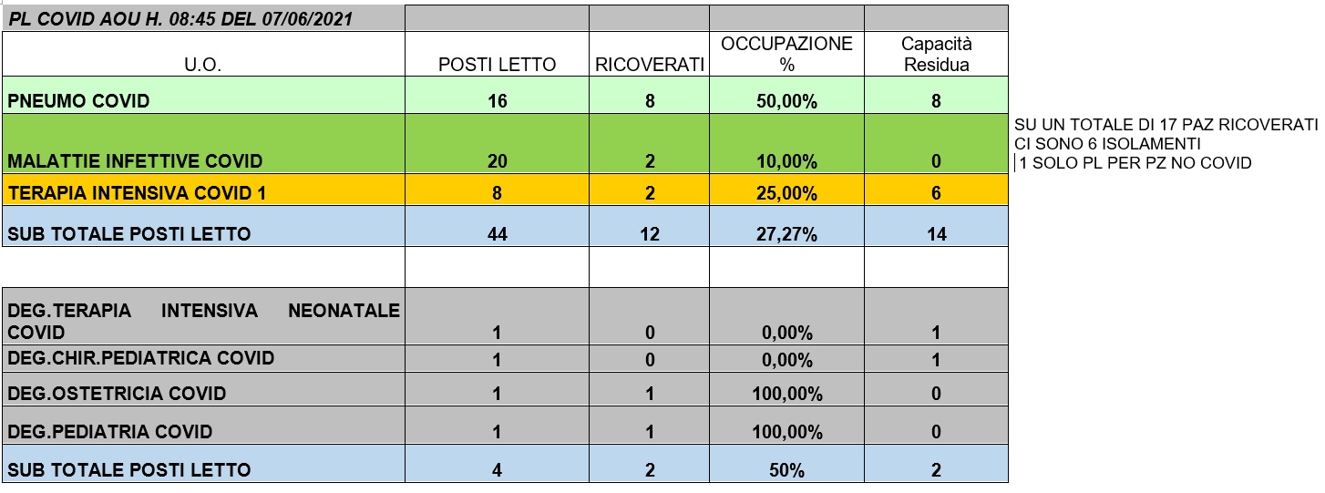 Situazione posti letto reparti Covid 7 giugno 2021 - ore 8.45.jpg