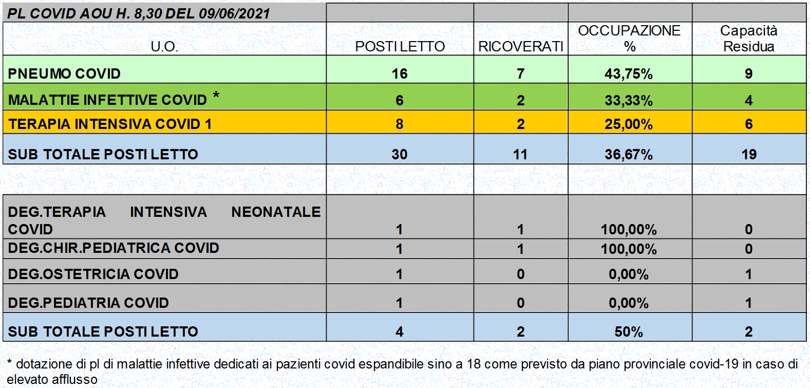 Situazione posti letto reparti Covid 9 Giugno 2021 - ore 8.30.jpg