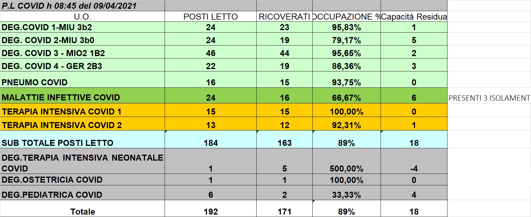 Situazione posti letto reparti Covid 9 aprile 2021 - ore 8.45.jpg