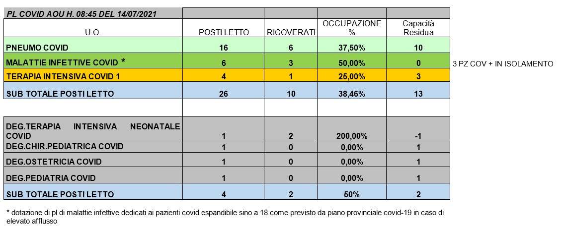 Situazione posti letto reparti Covid14 luglio 2021 - ore 8.30.jpg